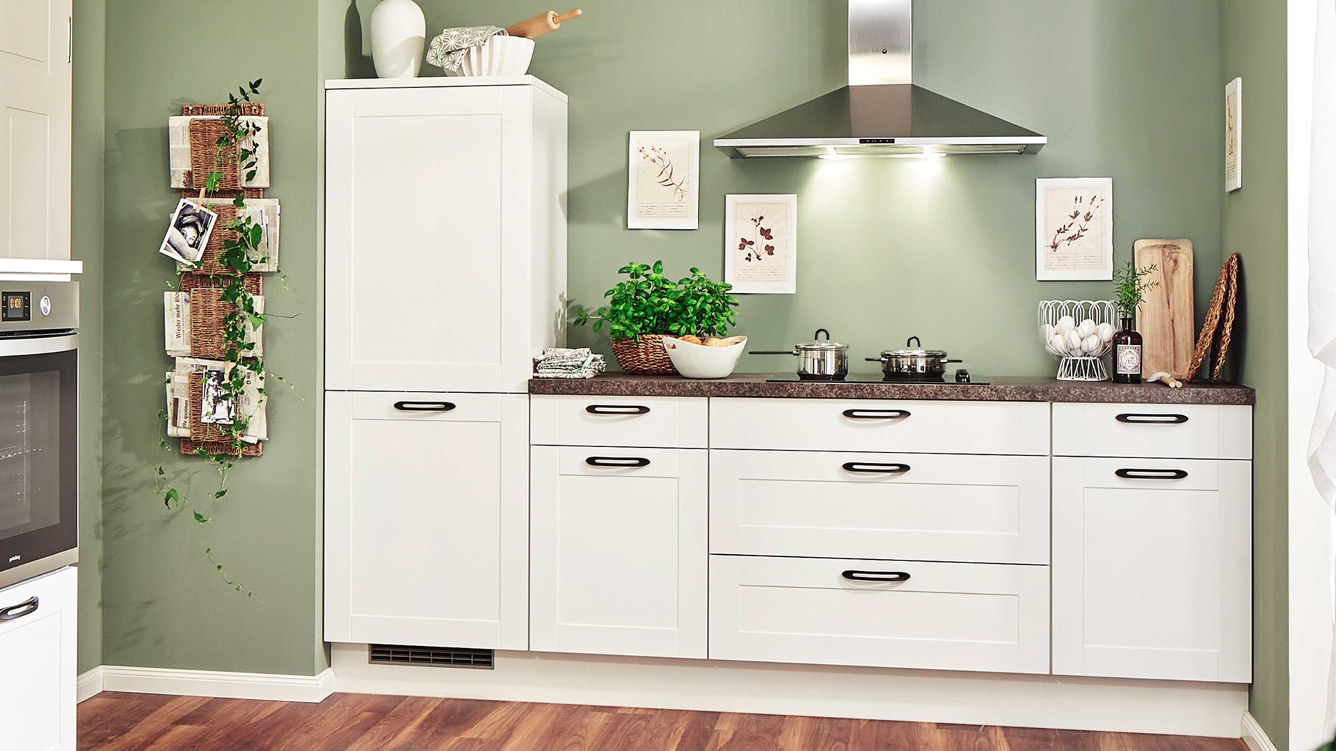 Diese pino Einbauküche kombiniert mattweiße Fronten mit weißen Korpussen und Sockelblenden. Einen stilvollen Akzent setzen die Arbeitsplatten in graubrauner Granit-Nachbildung. Edle Bügelgriffe runden die modern-elegante Optik perfekt ab.