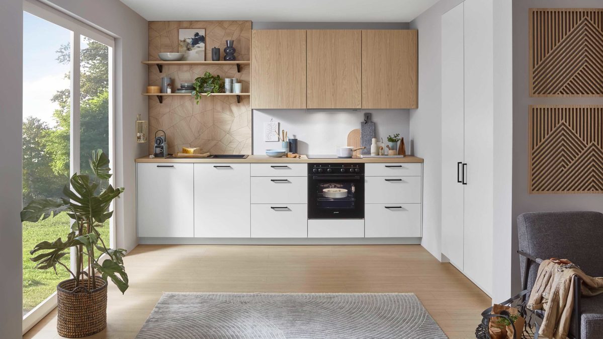 Weiß trifft Eiche Como - nobilia® Einbauküche Laser mit Geräten und Stauraumschränken