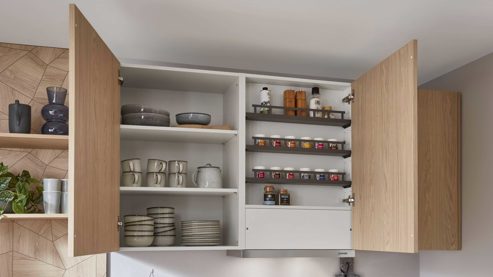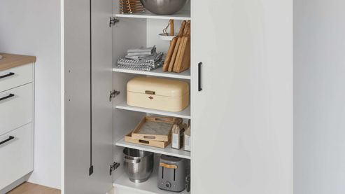 Ergänzt wird die Küchenzeile durch ca. 120 cm breite Hochschränke - für den Kühlschrank und viel Staumraum mit mit höhenverstellbaren Einlegeböden. Hier finden Vorräte, Geschirr und Küchenutensilien strukturiert ihren Platz – für mehr Ordnung und Übersicht im Alltag.