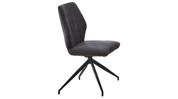 Er kombiniert ein mattschwarz lackiertes Stativgestell aus robustem Eisen mit einem taupefarbenen Mikrofaserbezug in Lederoptik und fügt sich in verschiedene Wohnstile harmonisch ein. Zu den optischen Highlights des Esszimmerstuhls gehört neben der Formensprache und den perfekt aufeinander abgestimmten Farben der markante Quereinzug im Rücken. Praktisch begeistern die Drehbarkeit um 180 Grad mit Rückholfunktion sowie die bodenschonenden Gleiter am Gestell.