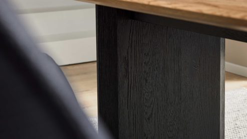 Das Tischgestell aus schwarz geölter, gebürsteter Asteiche bildet einen stilvollen Kontrast zur hellen Platte. Diese Kombination wirkt edel und harmonisch zugleich und überzeugt auch funktional: Das massive Holzgestell sorgt für Stabilität und Langlebigkeit – ideal für den täglichen Einsatz im Ess- oder Wohnbereich.