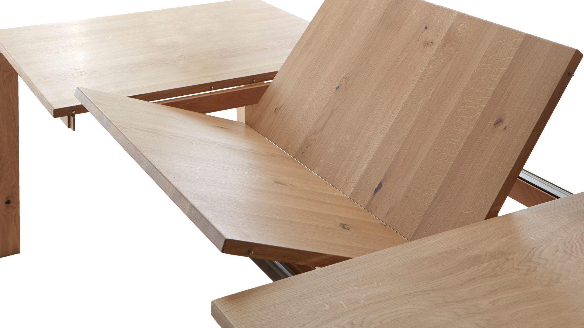 Der Ausziehtisch ist aus hell geöltem Wildeichefurnier gefertigt, das sowohl durch seine wunderschöne Optik als auch mit der hellen Farbe jeden Einrichtungsstil komplettiert.