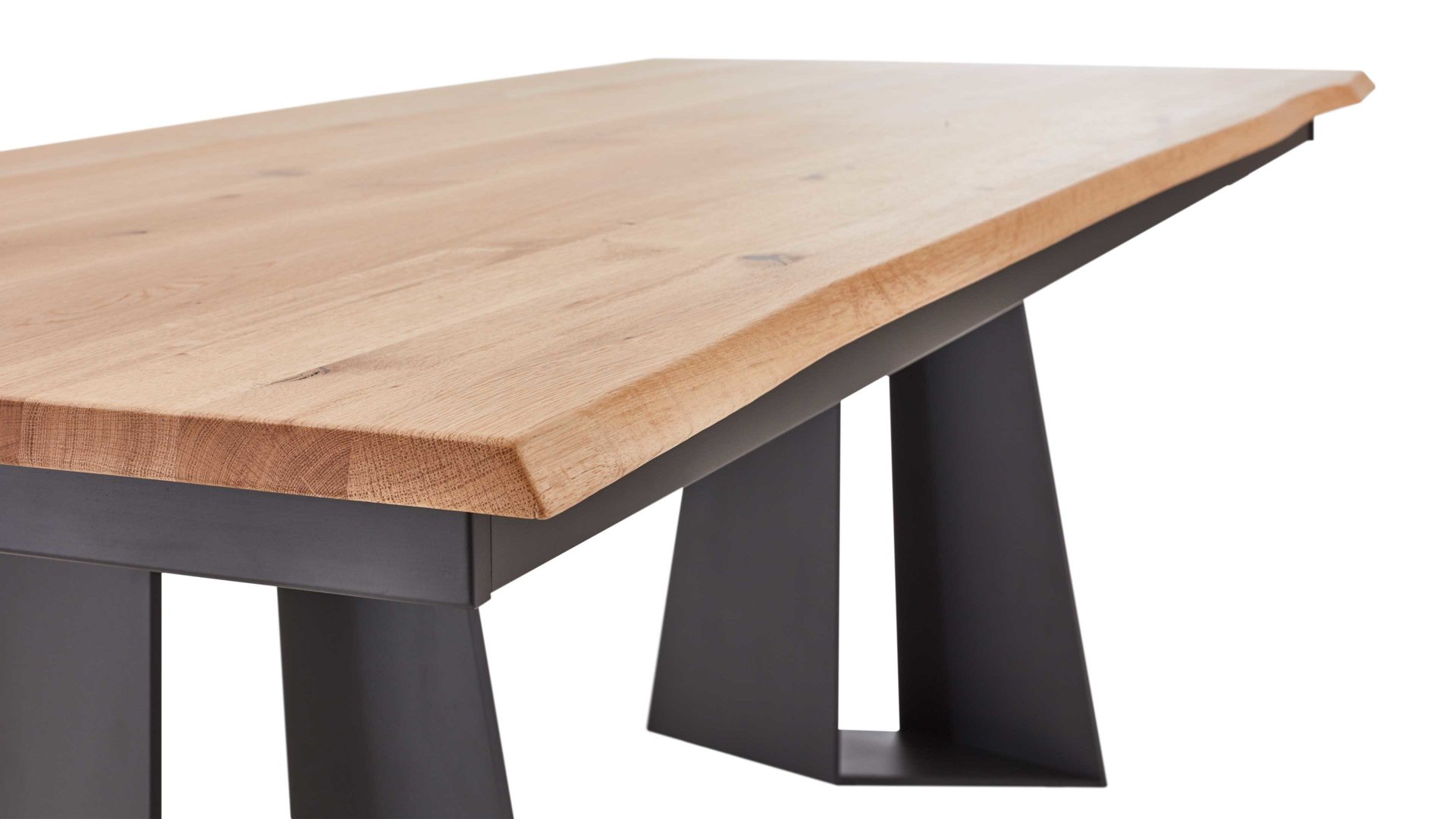 Als Highlight des Esszimmertisches fungiert die Echtholzplatte mit Baumkante. Sie besteht aus soft gebürsteter und geölter heller Wildeiche und ist ca. 25 mm stark. Für die nötige Standstabilität sorgt das robuste matt anthrazitfarbene Metallgestell.
