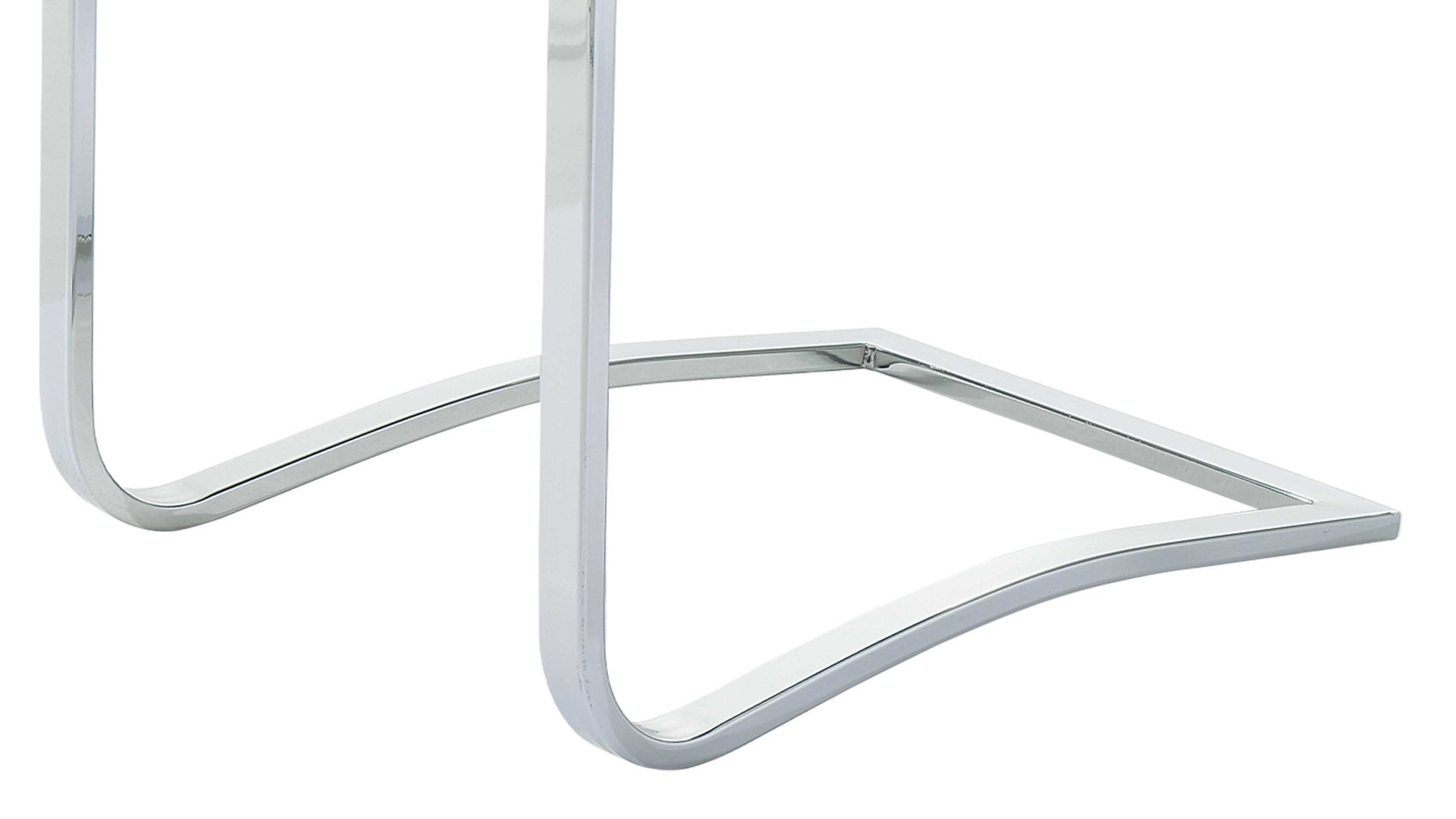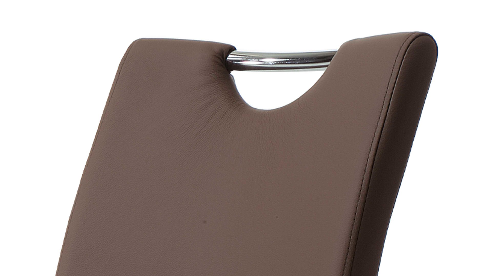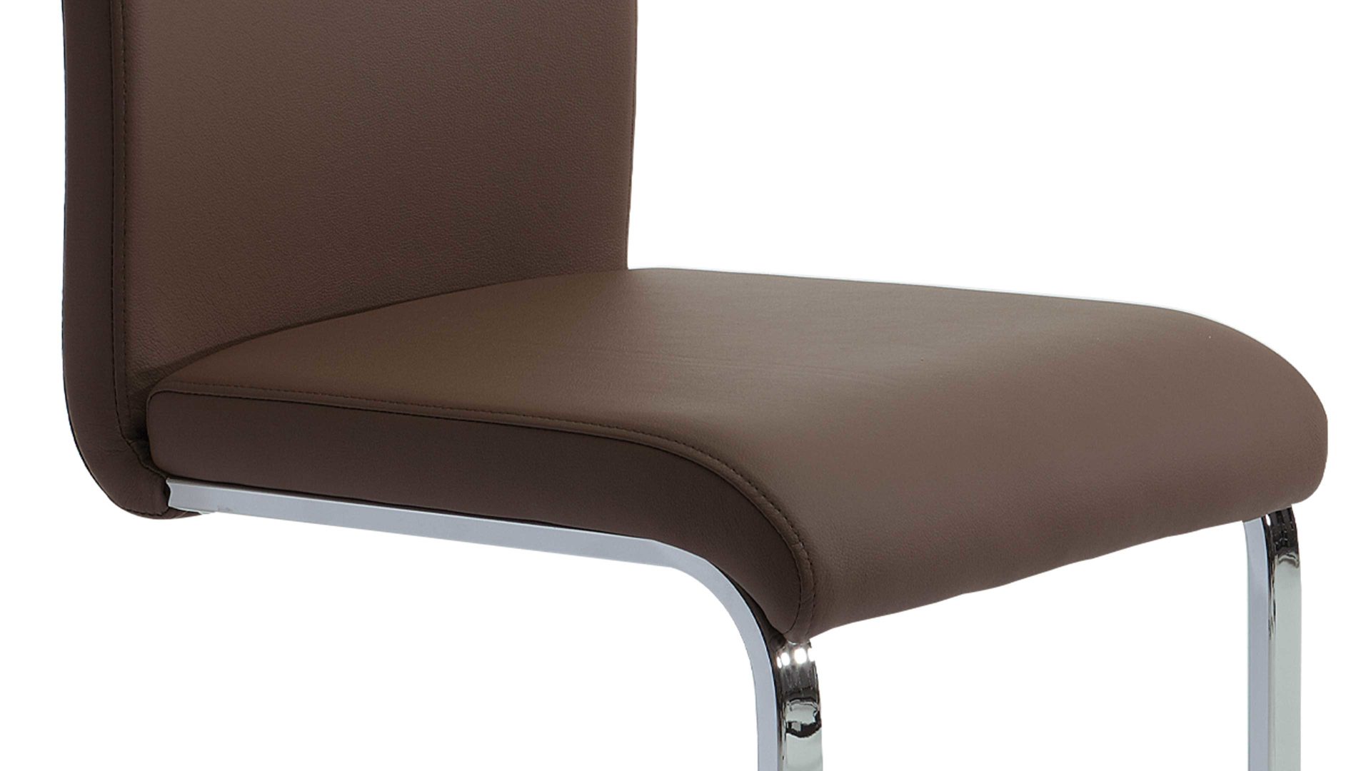 Die Rückenlehne sowie die Sitzfläche des Freischwingers sind bequem gepolstert. Der pflegeleichte und robuste Kunstlederbezug in Braun setzt sich stilvoll von dem modernen Chromgestell des Standfußes ab. Durch das verarbeitete verchromte Flachrohr ist es besonders stabil.