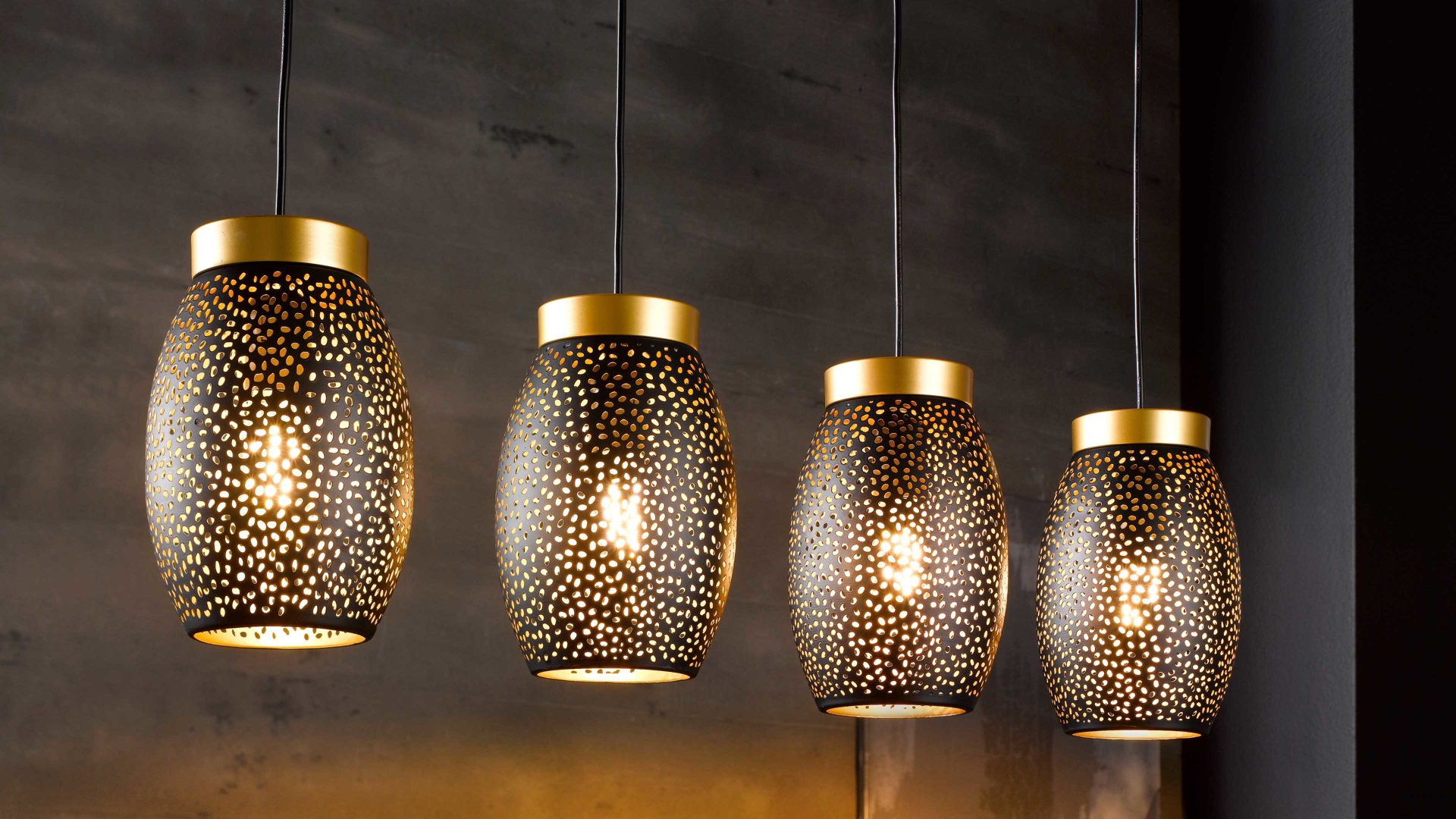 GLOBO Hängelampe Narri | schwarzer Lampenschirm mit Dekorstanzungen, innen goldfarben | goldfarbene Sockel | Maße ca. 90 x 15 cm (LxB) | Kabellänge ca. 120 cm | bedienbar über Wand-Lichtschalter | ohne Leuchtmittel, benötigt werden 4x E27, maximal jeweils 40 Watt | geeignet für Leuchtmittel der Energieeffizienzklasse A bis G (Spektrum A bis G) | Lampenserie