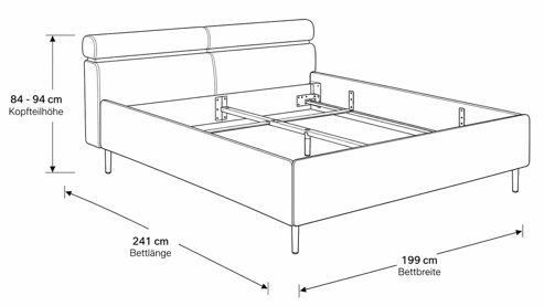 Besonders praktisch ist das Polsterkopfteil mit manueller getrennter Kopfteilverstellung. So kannst du die Position individuell anpassen und dich beim Lesen, Fernsehen oder Entspannen im Bett noch komfortabler anlehnen. Das Bettgestell misst ca. 199 x 84 - 94 x 241 cm (BxHxL), die Liegefläche beträgt ca. 180 x 200 cm (BxL) und die Bettseitenhöhe liegt bei ca. 31 cm. Dank der verstellbaren Einlegetiefe für Lattenrostrahmen von ca. 8,5 bis 23,5 cm lässt sich das Polsterbett flexibel auf deine persönliche Schlaflösung abstimmen. Für deinen optimalen Schlafkomfort kannst du Matratzen und Lattenrostrahmen gegen Mehrpreis genau auf deine Vorlieben abstimmen.