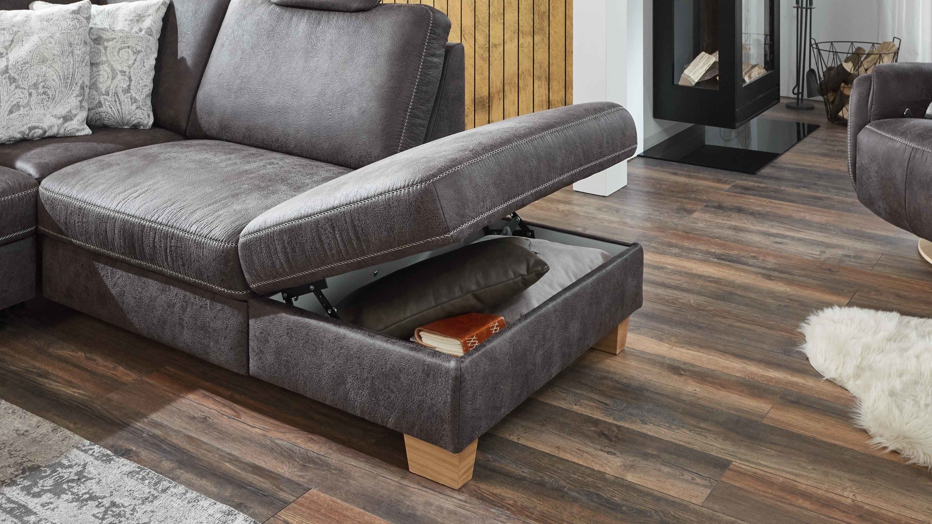 In der weiß beschichteten Schublade mit Stofffront verstauen Sie Kissen oder Gesellschaftsspiele. Ein weiteres Plus ist die Aufklappfunktion des Abschlusshockers - hier finden Decken oder andere große Dinge ihren festen Platz.
