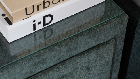 Der moosgrüne Chenillebezug verleiht der Nachtkonsole eine warme, wohnliche Ausstrahlung und sorgt gleichzeitig für eine angenehme Haptik. Die elegante Klarglasauflage setzt einen modernen Akzent und schützt die Oberfläche – ideal für Lampe, Bücher oder dein Smartphone.