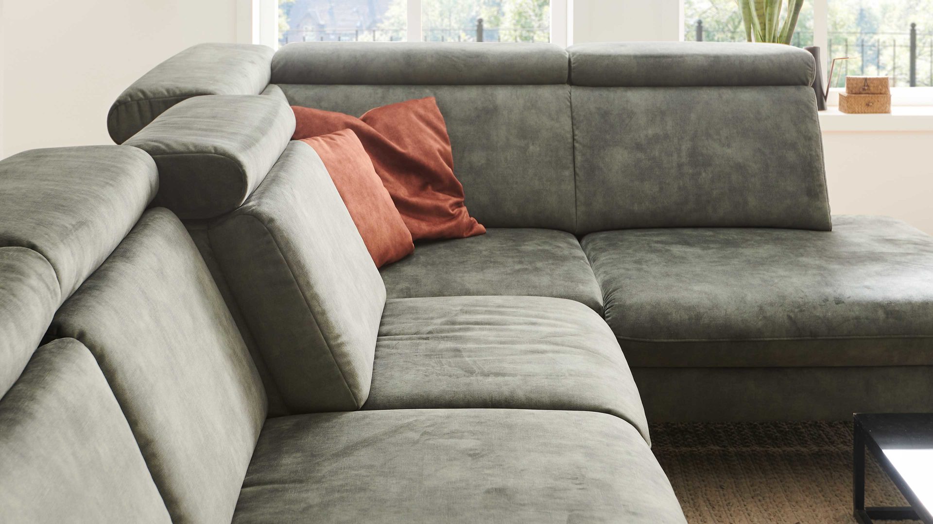moosfarbener Veloursbezug in Samtoptik und hochwertige Polyätherschaumfüllung