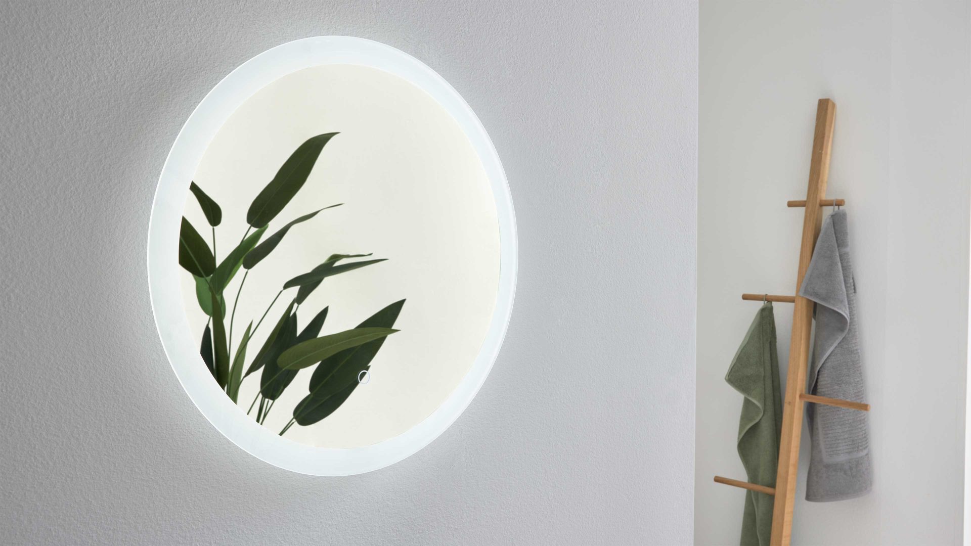 Zwei runde LED-Spiegel (Typ 15201, Ø ca. 60 cm, Tiefe ca. 2,5 cm) ergänzen das Ensemble. Sie verfügen über ein umlaufendes sandgestrahltes LED-Lichtfenster (ca. 4 cm breit), fest verbaute LED-Leuchtmittel mit 12 Watt, 5700 Kelvin, Touchsensor und LED-Konverter. Energieeffizienzklasse F (Spektrum A–G), Schutzklasse IP44. Für die Inbetriebnahme wird ein Starter-Set benötigt.