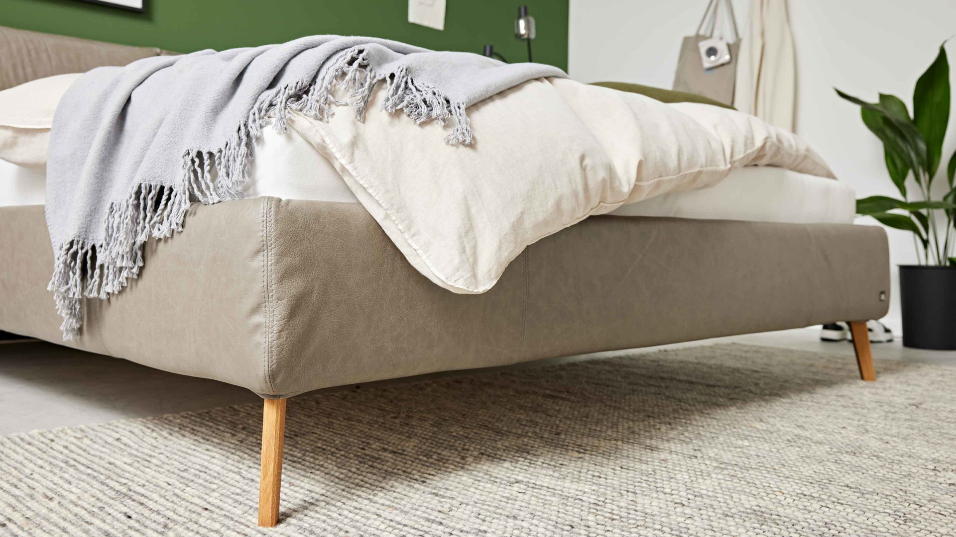 Für eine stilvolle Inszenierung stehen elf unterschiedliche Fußvarianten in diversen Farben und Höhen zur Verfügung. Auf Wunsch lässt sich das Bett mit praktischem Stauraum ausstatten – ideal für Decken, Bettwäsche oder saisonale Accessoires.
