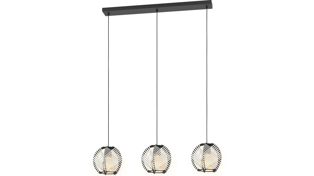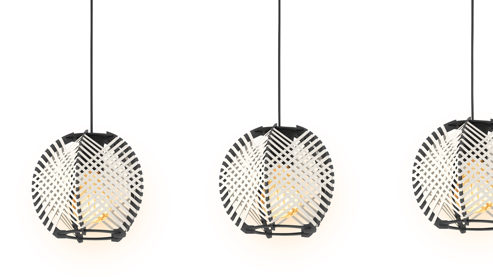 Lampenschirme aus schwarzem Holzwerkstoff umwickelt mit weißem Textilband