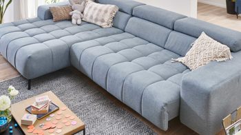 Zu den Highlights der Couchlandschaft gehören die mittels Rasterbeschlag mehrfach verstellbaren Kopfpolster an allen Elementen. Des Weiteren gewährleisten die hohen Füße, die preisgleich auch in Schwarz erhältlich sind, eine beachtliche Bodenfreiheit. Letztere ist perfekt für den Einsatz eines Staubsaugerroboters.