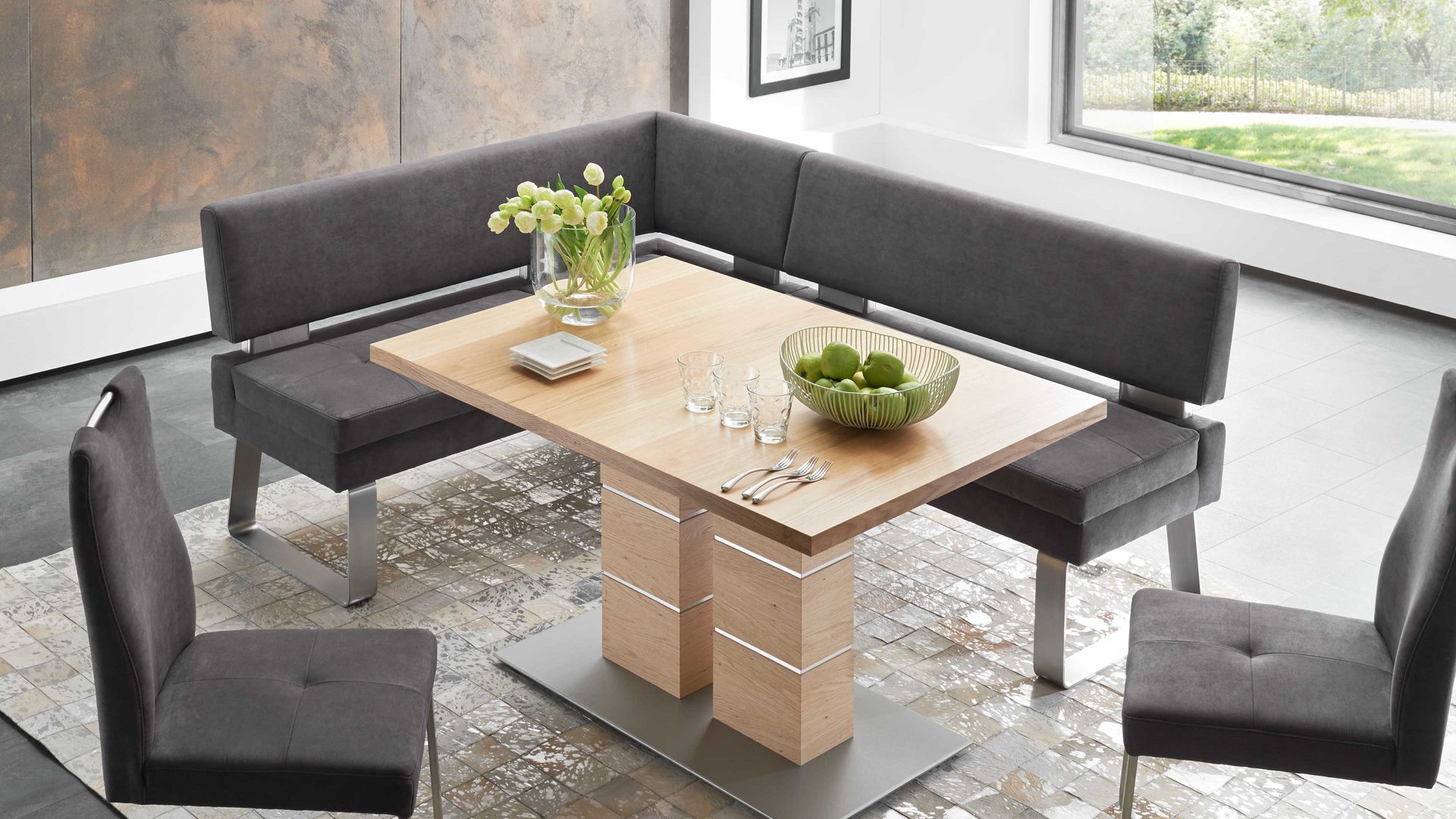 Stilvoll und elegant präsentiert sich die Dinnerbank mit einem grauen LongLife-Dicklederbezug, der sich mit den Nähten im selben Ton harmonisch in Ihre Kücheneinrichtung einfügt. Versammeln Sie Familie und Freunde um Ihren Küchentisch auf der Küchenbank, die Sie über Eck stellen und so auch ungenutzten Raum optimal ausfüllen.