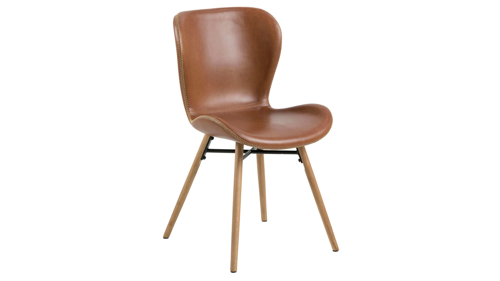 Der Vierfußstuhl verbindet schlicht-moderne Eleganz mit ausgewählten natürlich-warmen Details. Vier geölte Eichenholzfüße bilden die stabilisierende Basis - sie strahlen einladende Gemütlichkeit aus. Das schwarz lackierte Metallkreuz, das die Füße robust zusammenhält, sorgt für einen attraktiven Hell-Dunkel-Kontrast und setzt damit einen herrlichen Akzent. Bezogen ist der hochwertig verarbeitete Stuhl mit Kunstleder in nobler Cognacfarbe. Ein weiteres visuelles Highlight ist die umlaufende Ziernaht.