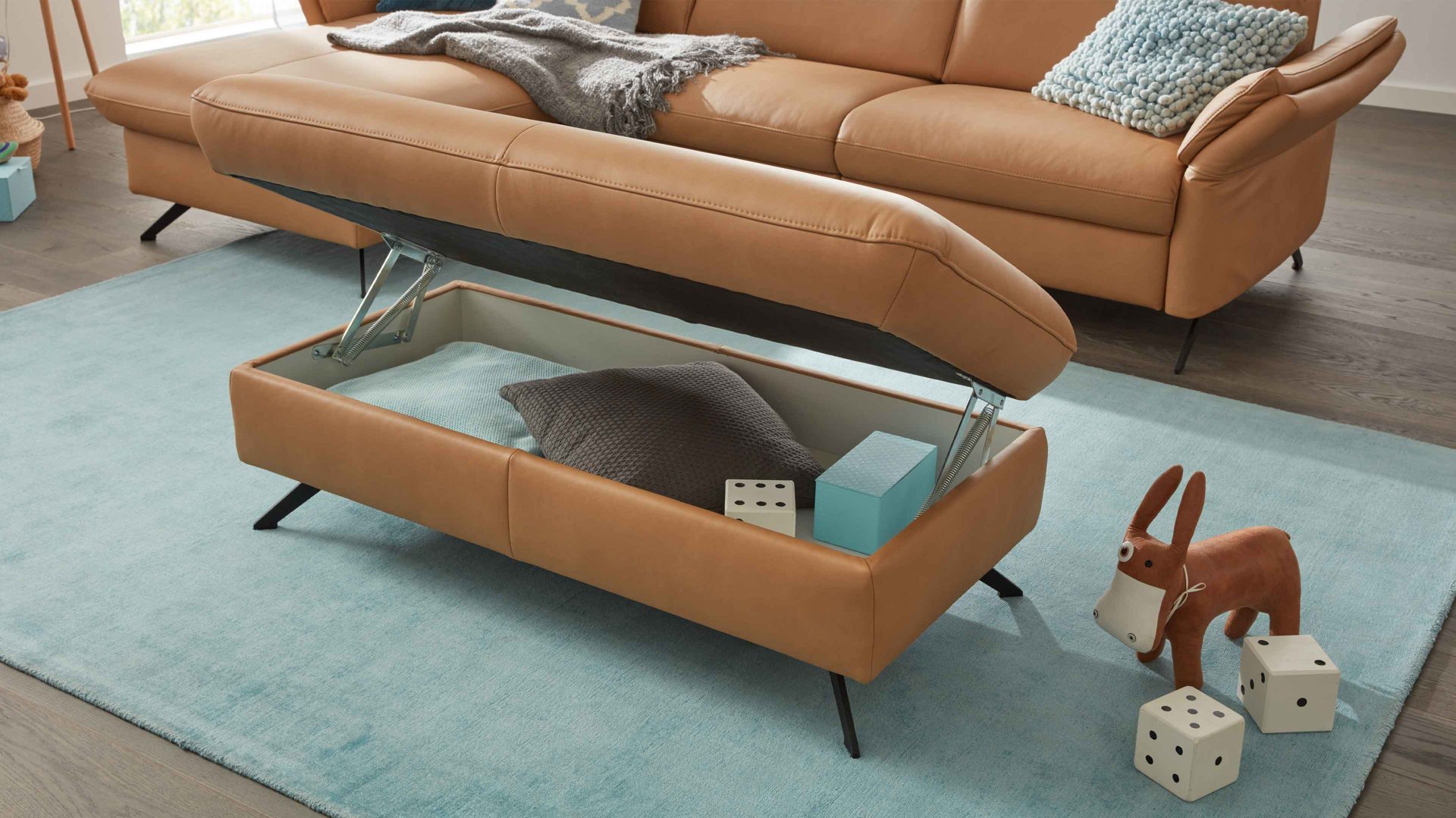 Der XXL-Funktionshocker aus der Modulmaster-Polsterserie MM-PN1161 kombiniert honigfarben pigmentiertes Glattleder mit mattschwarzen Metallfüßen. Er strahlt moderne Eleganz aus.