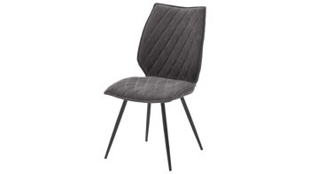 Der Polsterstuhl Setubal zeichnet sich insbesondere durch sein elegantes Design mit modernen und Vintage-Elementen aus. Für die nötige Standsicherheit sorgt das robuste mattschwarz lackierte Metallgestell. Der edle dunkelgraue Bezug präsentiert sich auf der Innenseite in Chenille-Optik und außen im Vintage-Look mit Keder.