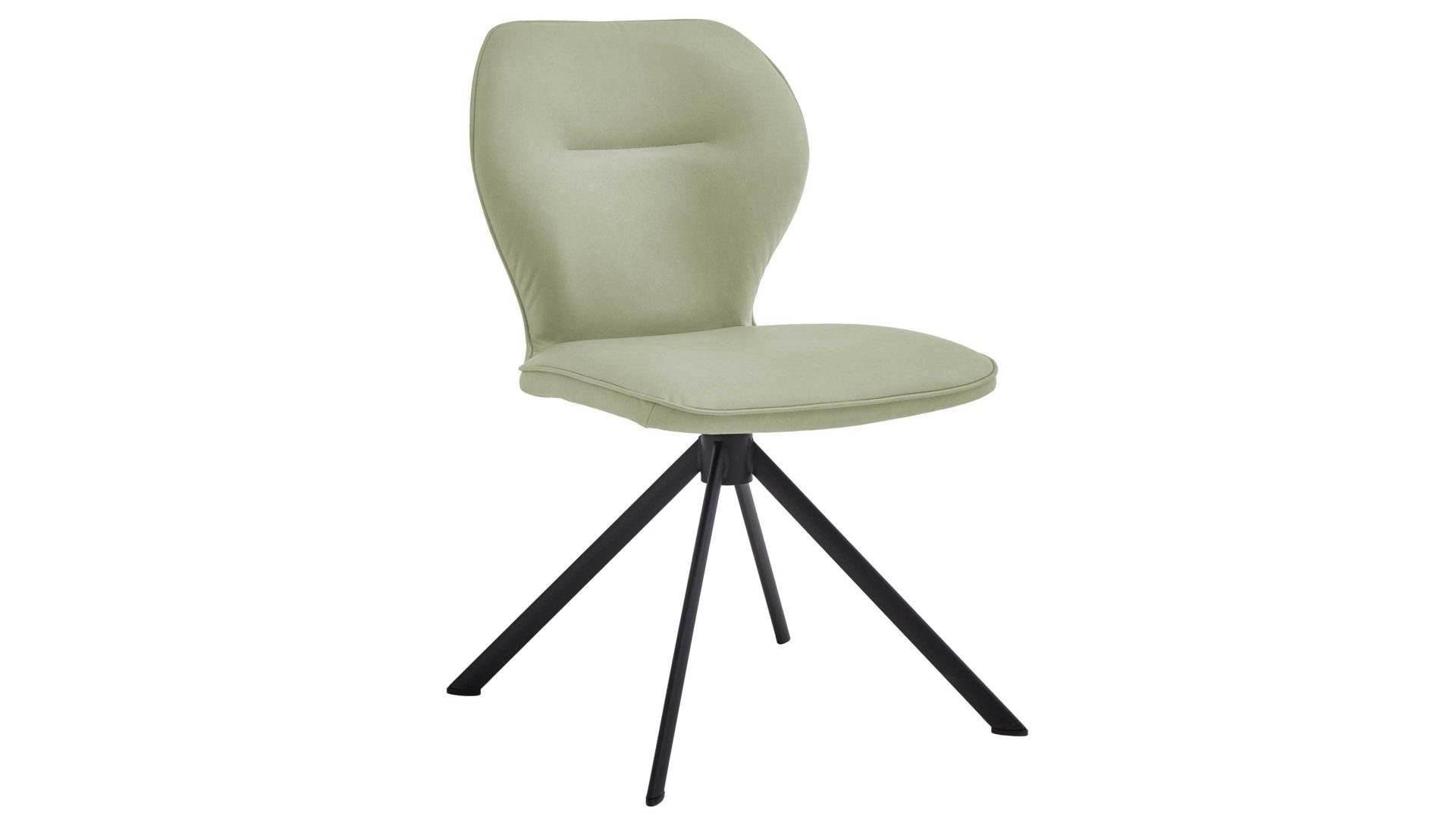 Er kombiniert ein mattschwarz lackiertes Stativgestell aus robustem Eisen mit einem lindgrünen Mikrofaserbezug in Lederoptik und fügt sich in verschiedene Wohnstile harmonisch ein. Zu den optischen Highlights des Esszimmerstuhls gehört neben der Formensprache und den perfekt aufeinander abgestimmten Farben der markante Quereinzug im Rücken. Praktisch begeistern die Drehbarkeit um 180 Grad mit Rückholfunktion sowie die bodenschonenden Gleiter am Gestell.