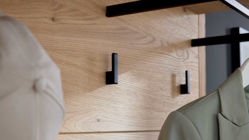 Die furnierte Wandgarderobe verfügt über einen Ablageboden, eine Garderobenstange und fünf Kleiderhaken – ideal für häufig genutzte Jacken oder Taschen. Maße: ca. 90 x 111 x 28 cm (B/LxHxT).