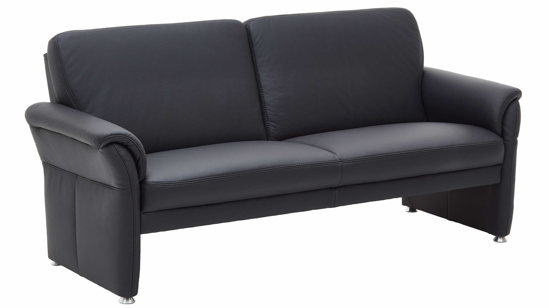Mit den stabilen Aluminiumfüßen und dem klassisch-schwarzen Lederbezug strahlt dieser Dreisitzer moderne Eleganz aus. Die Materialien und Farben harmonieren hervorragend miteinander. Dank ihrer Zeitlosigkeit fügen sie sich in verschiedene Einrichtungskonzepte absolut stimmig ein. Die Maße der Ledercouch belaufen sich auf ca. 185 x 90 x 85 cm (LxHxT), bei einer Sitzhöhe von ca. 46 cm und einer Sitztiefe von ca. 53 cm.