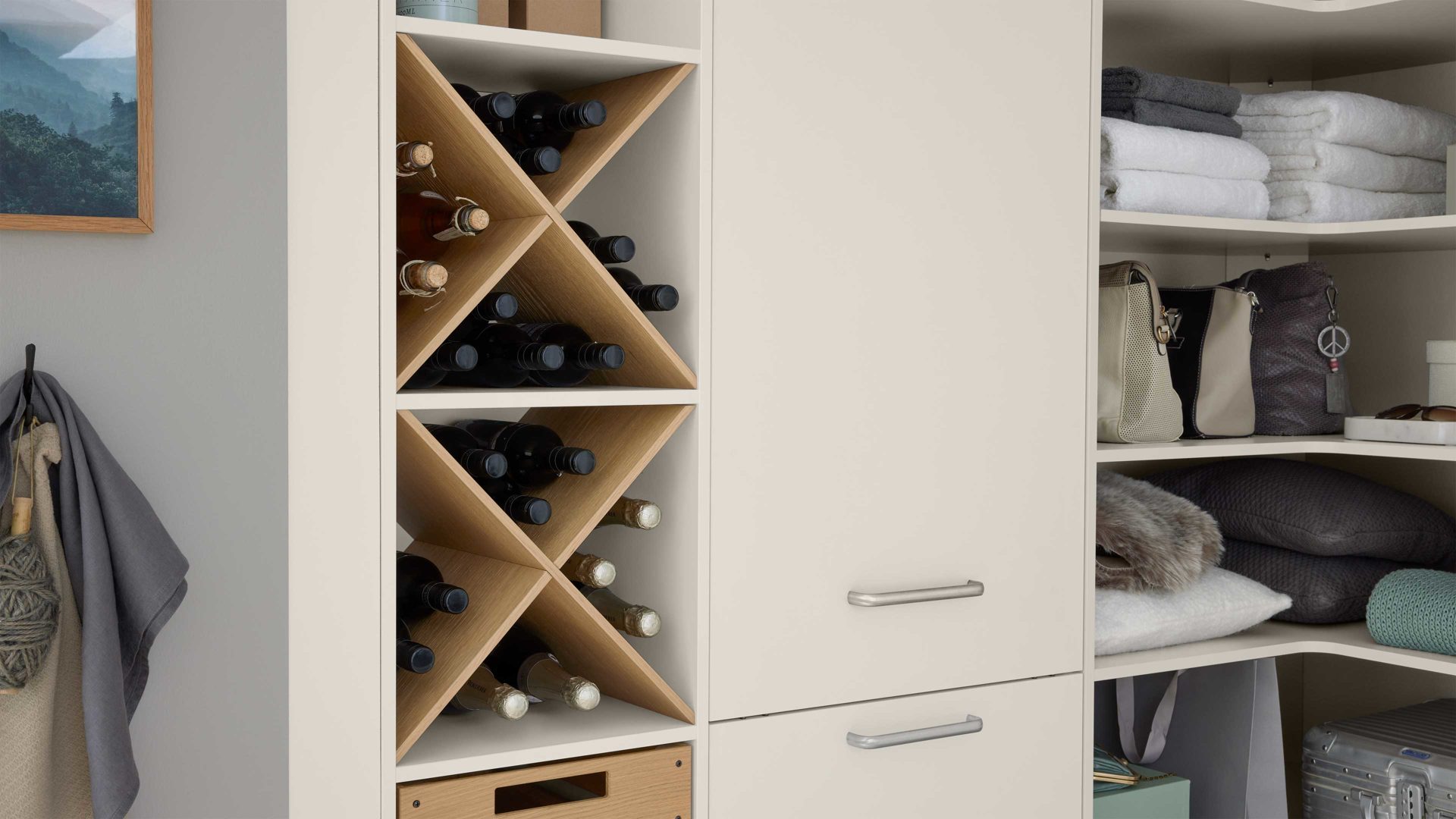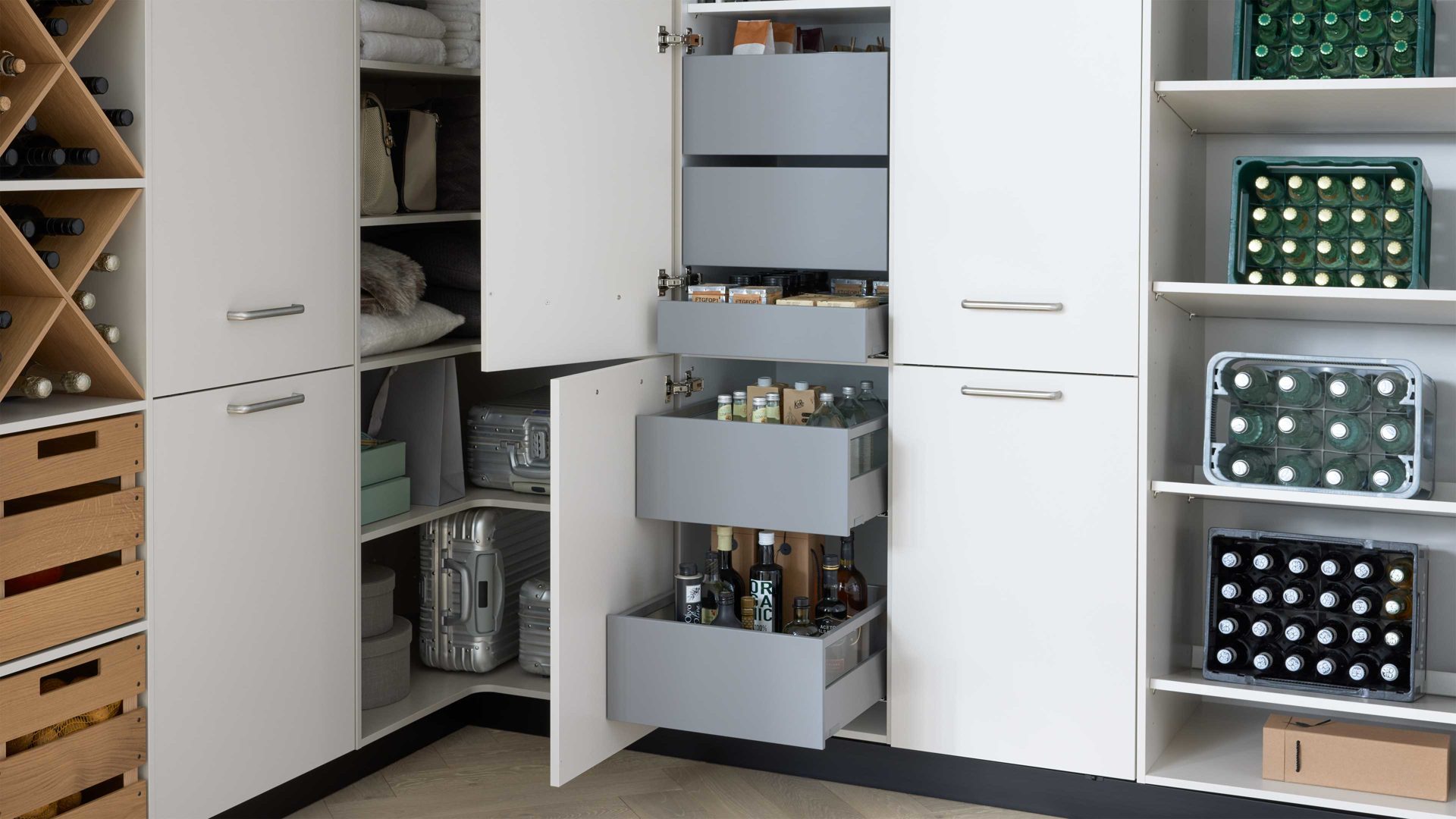Besonders praktisch sind die holzfarbenen Kreuzregale, die sich ideal zur Aufbewahrung von Flaschen oder Vorräten eignen. Ergänzt werden sie durch passende Boxen, die zusätzlichen Stauraum bieten und Ordnung schaffen.