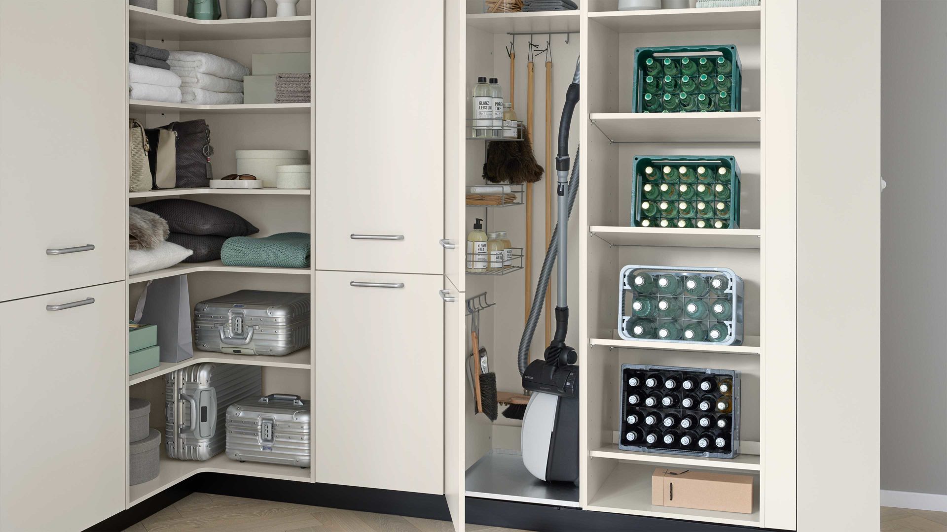 Verschiedene Schrankelemente, offene Bereiche und durchdachte Aufteilungen ermöglichen es Ihnen, Reinigungsutensilien, Vorräte, Wäsche und Alltagsgegenstände übersichtlich zu verstauen.