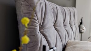 Das weich gepolsterte Kopfteil mit dekorativer Knopfheftung wird zum stilvollen Blickfang und lädt zum entspannten Zurücklehnen ein. Die glatt bezogenen Bettseiten sorgen mit ihrer geradlinigen Formgebung für ein modernes, aufgeräumtes Gesamtbild. So entsteht ein stimmiges Design, das Komfort und Ästhetik ideal kombiniert.