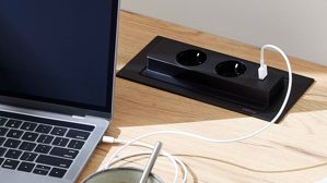 Aufsatz- und Unterbauregal für den Schreibtisch, kabellose Lademöglichkeit, Einbausteckdose und weitere dargestellte Einrichtungsgegenstände sind separat gegen Mehrpreis bestellbar.