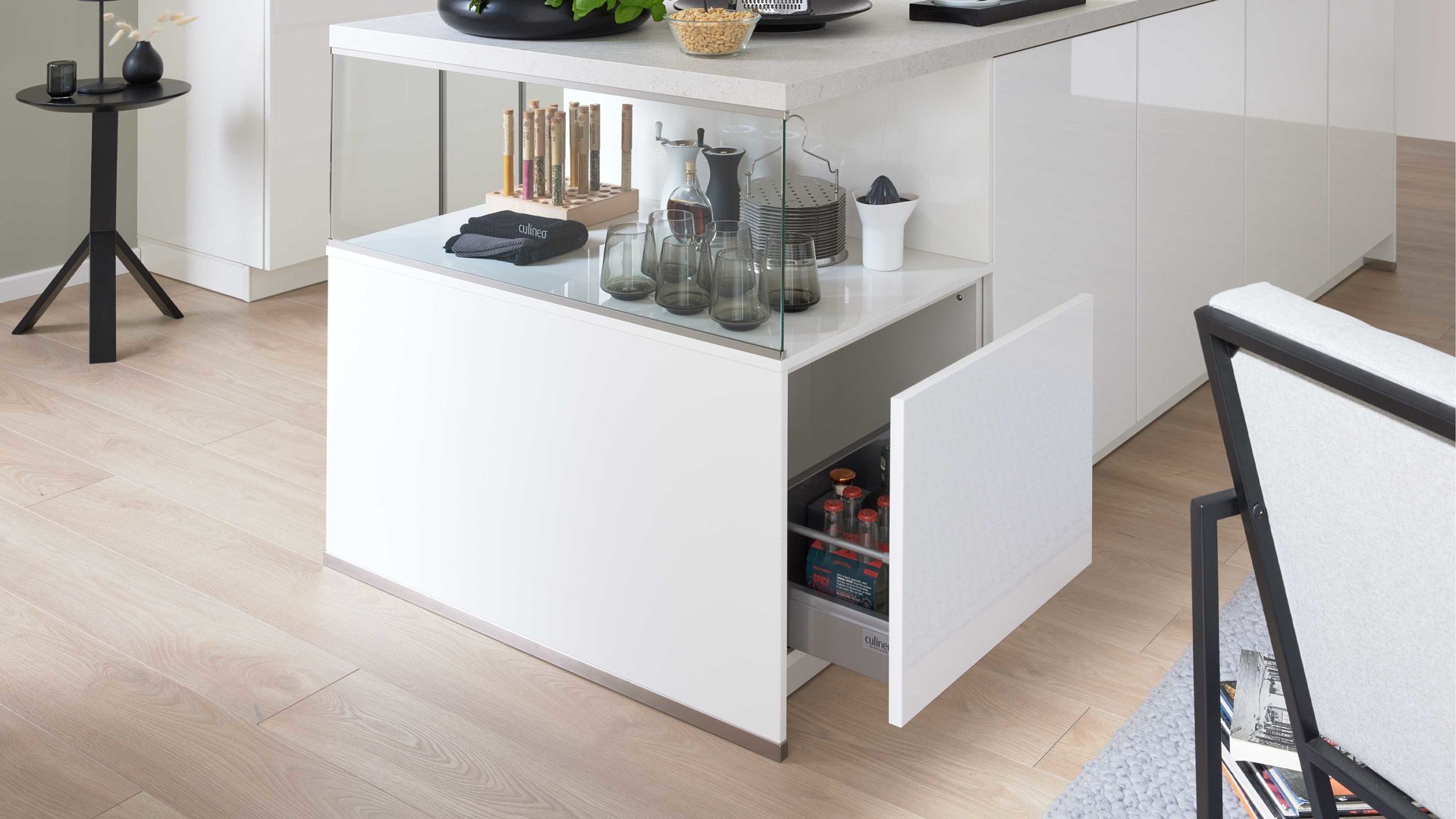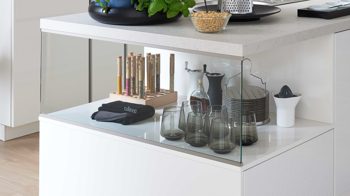 Für frische Luft beim Kochen sorgt der leistungsstarke Airforce Dunstabzug SQUAREWH, der mit der Energieeffizienzklasse B (Spektrum A+++ bis D) ausgezeichnet ist. Sein elegantes Design fügt sich nahtlos in das helle, moderne Gesamtbild der Küche ein.