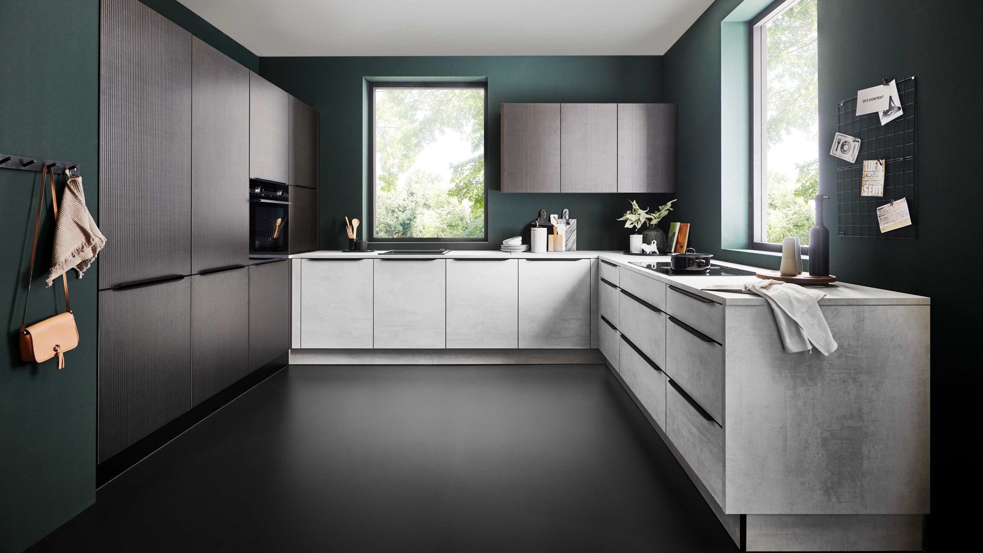 weiße Beton-Nachbildung, kombiniert mit kaffeefarbener gerillter Holzoptik mit Melaminoberflächen, Arbeitsplatten in weißer Beton-Nachbildung und mattschwarzen Metallgriffen