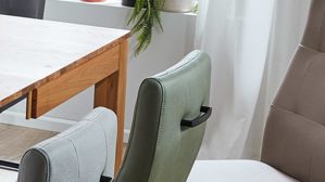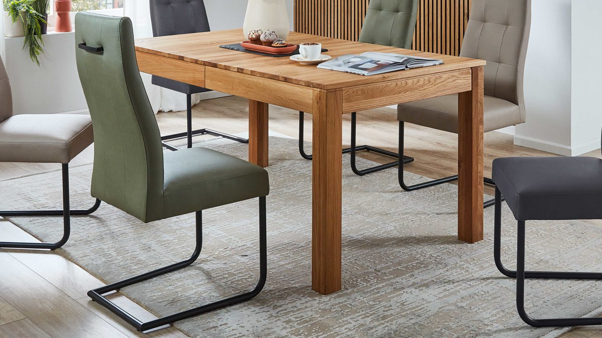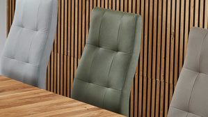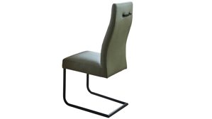 olivgrüner Stoffbezug in Lederoptik, kombiniert mit mattschwarz lackiertem Metall