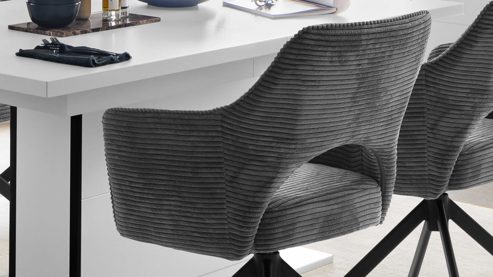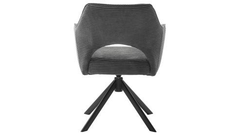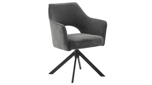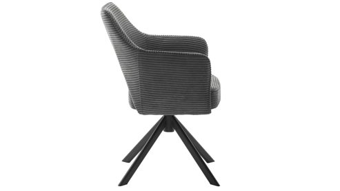 anthrazitfarbener Breitcordbezug und rundes, konisch zulaufendes, mattschwarzes Metallgestell
