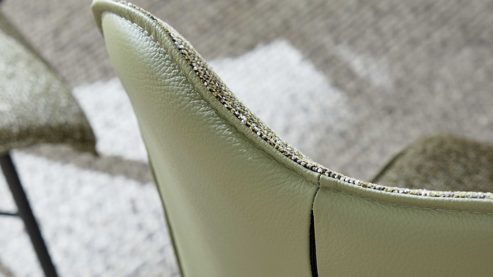 Ergänzt wird die Essgruppe durch vier Polsterstühle, die einen spannenden Materialmix bieten: außen jadefarbenes Leder, innen moosfarben melierter Webstoff – stylish, modern und angenehm weich. Auch hier sorgen die Steppnaht in der Rückenlehne und das umbragrau pulverbeschichtete Metall-Vierfußgestell für ein harmonisches Gesamtbild. Mit ca. 48 x 91 x 61 cm (BxHxT) sowie Sitzhöhe ca. 48 cm und Sitztiefe ca. 43 cm fügen sie sich perfekt ein.