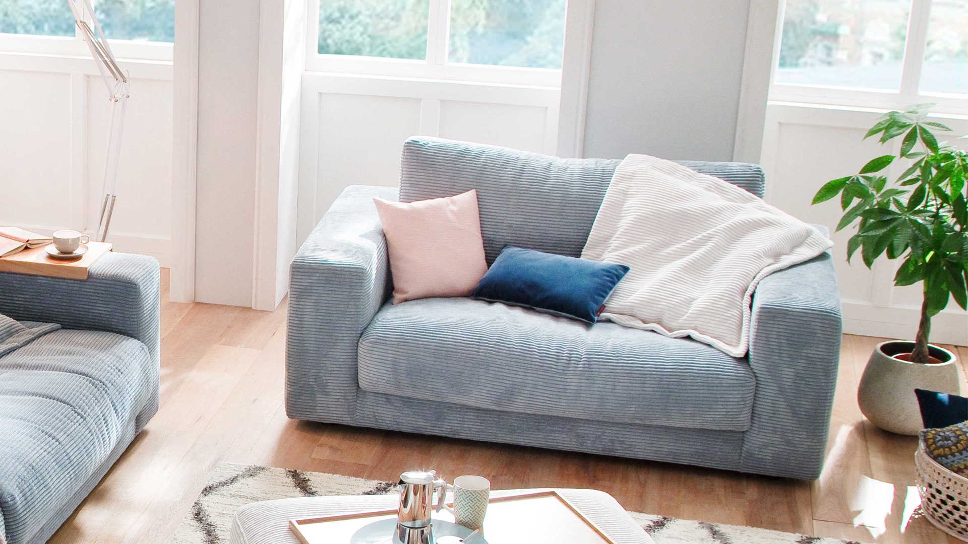 Der 2-Sitzer medium aus dem Polsterprogramm SOFAkultur Seventies ist mit hellblauem Cord bezogen und mit schwarzen Kunststoff-Gleitfüßen versehen. Er strahlt Modernität und Gemütlichkeit aus. Dank der schichtweise aufgebauten PUR-Schaumpolsterung auf einer gut stützenden Wellenunterfederung bietet das Sofa hohen Sitzkomfort. Dazu tragen auch die losen Rückenkissen mit Inlett bei.
