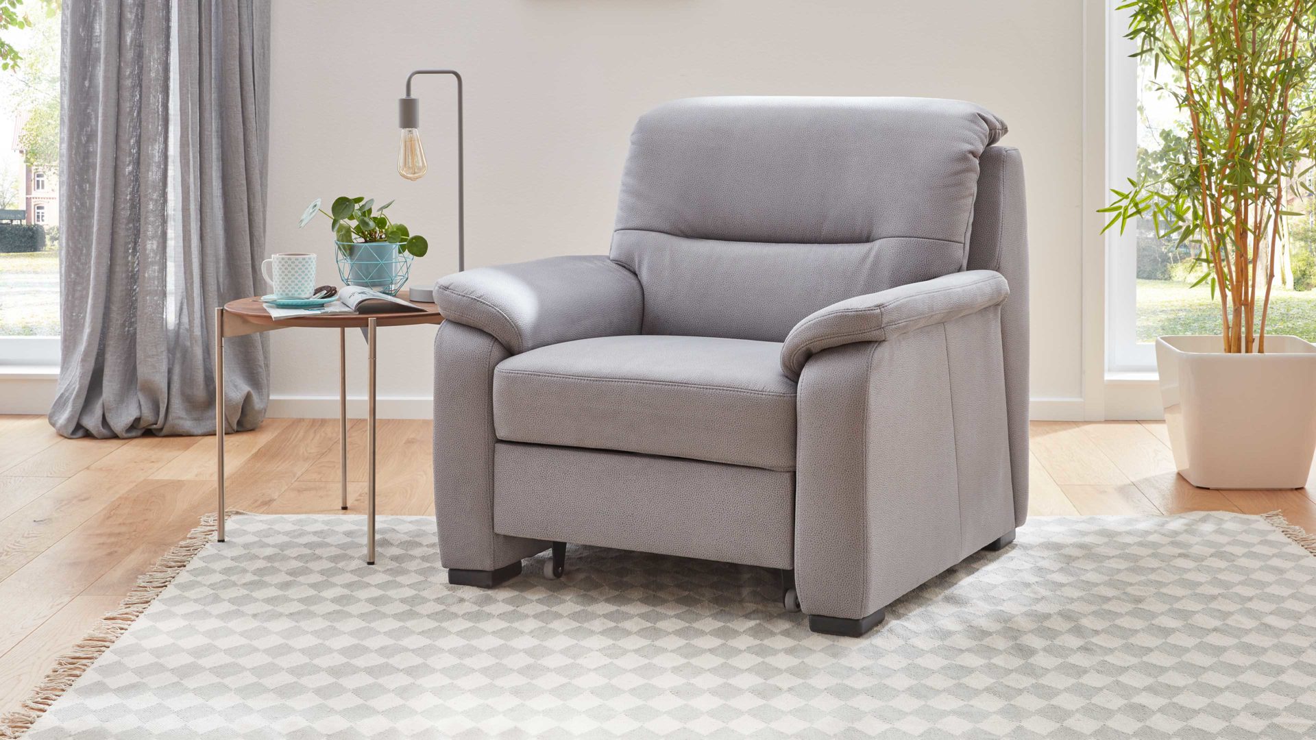 • Die Abbildung zeigt ein Wohnbeispiel, welches auch Dekoration sowie separat erhältliches Zubehör enthält. Im Lieferumfang enthalten ist der Sessel.