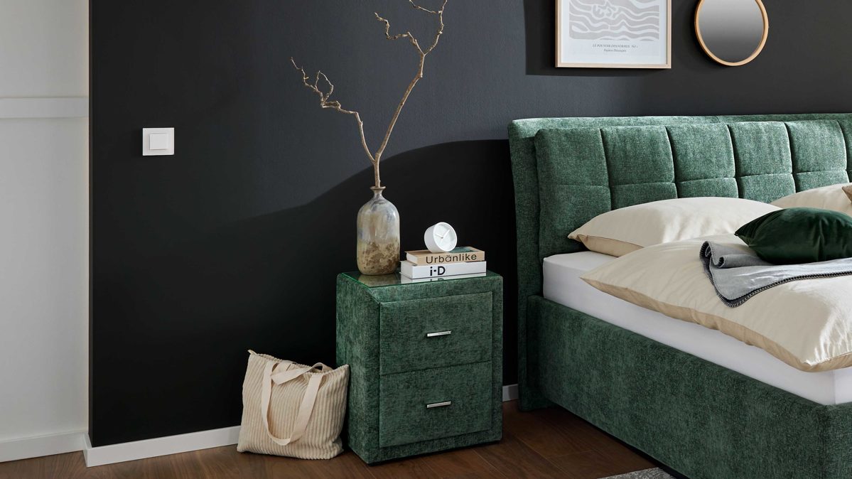 Kombiniere die Nachtkommode idealerweise mit dem passenden Polsterbett der Serie, um ein stimmiges Gesamtbild zu erzielen.