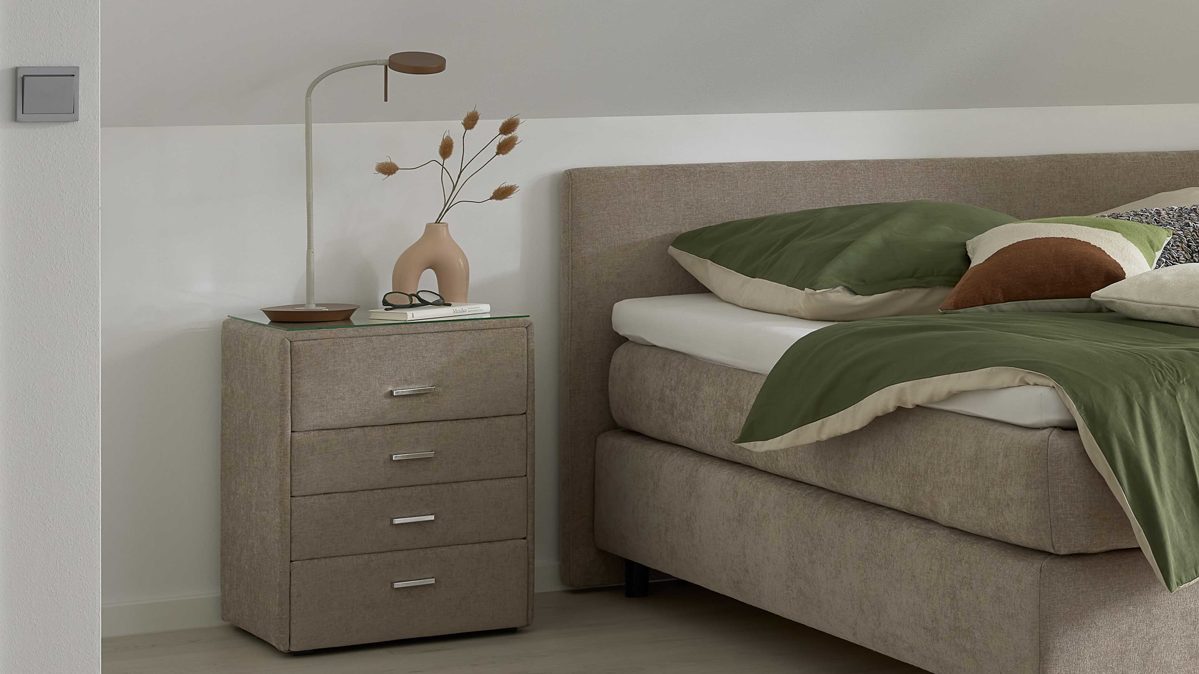 Kombiniere die Nachtkommode idealerweise mit dem passenden Polsterbett der Serie, um ein stimmiges Gesamtbild zu erzielen.