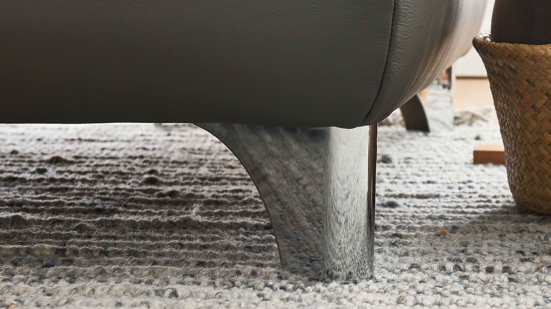 Das Ecksofa aus dem Modulmaster-Polsterprogramm MM-PN1078 kombiniert grau pigmentiertes Glattleder mit glänzenden Metall-Winkelfüßen. Es präsentiert sich modern und elegant.