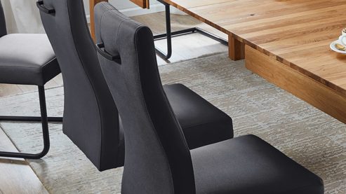 dunkelgrauer Stoffbezug in Lederoptik, kombiniert mit mattschwarz lackiertem Metall