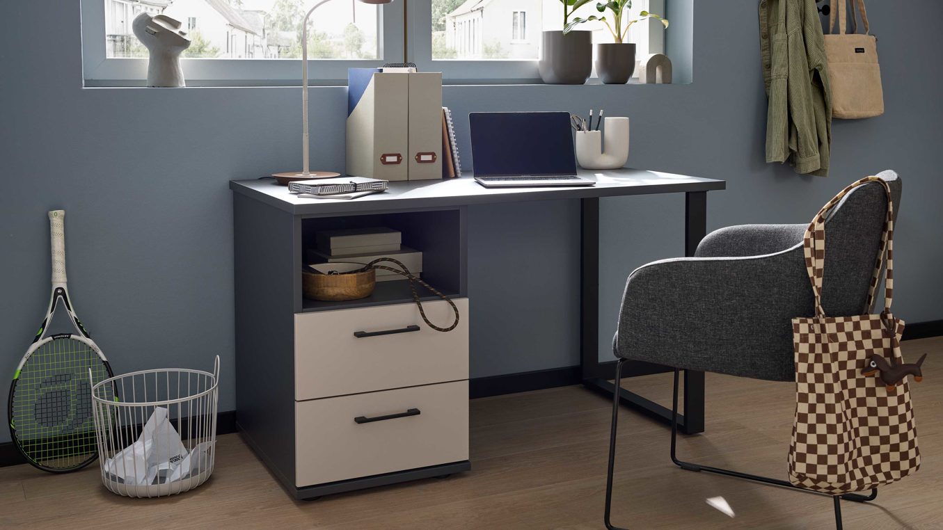 Der Schreibtisch aus der Interliving Jugendzimmer Serie 1701 überzeugt mit einem klaren, modernen Design und funktionalen Details für deinen Alltag. Die Kombination aus dunkelgrauem Korpus, sandgrauen Fronten und schwarzen Metallgriffen verleiht dem PC-Tisch eine zeitlose Optik. Besonders markant: die Arbeitsplatte mit schwarzem Metall-Kufengestell, die dem Schreibtisch einen modernen, fast schwebenden Charakter gibt.