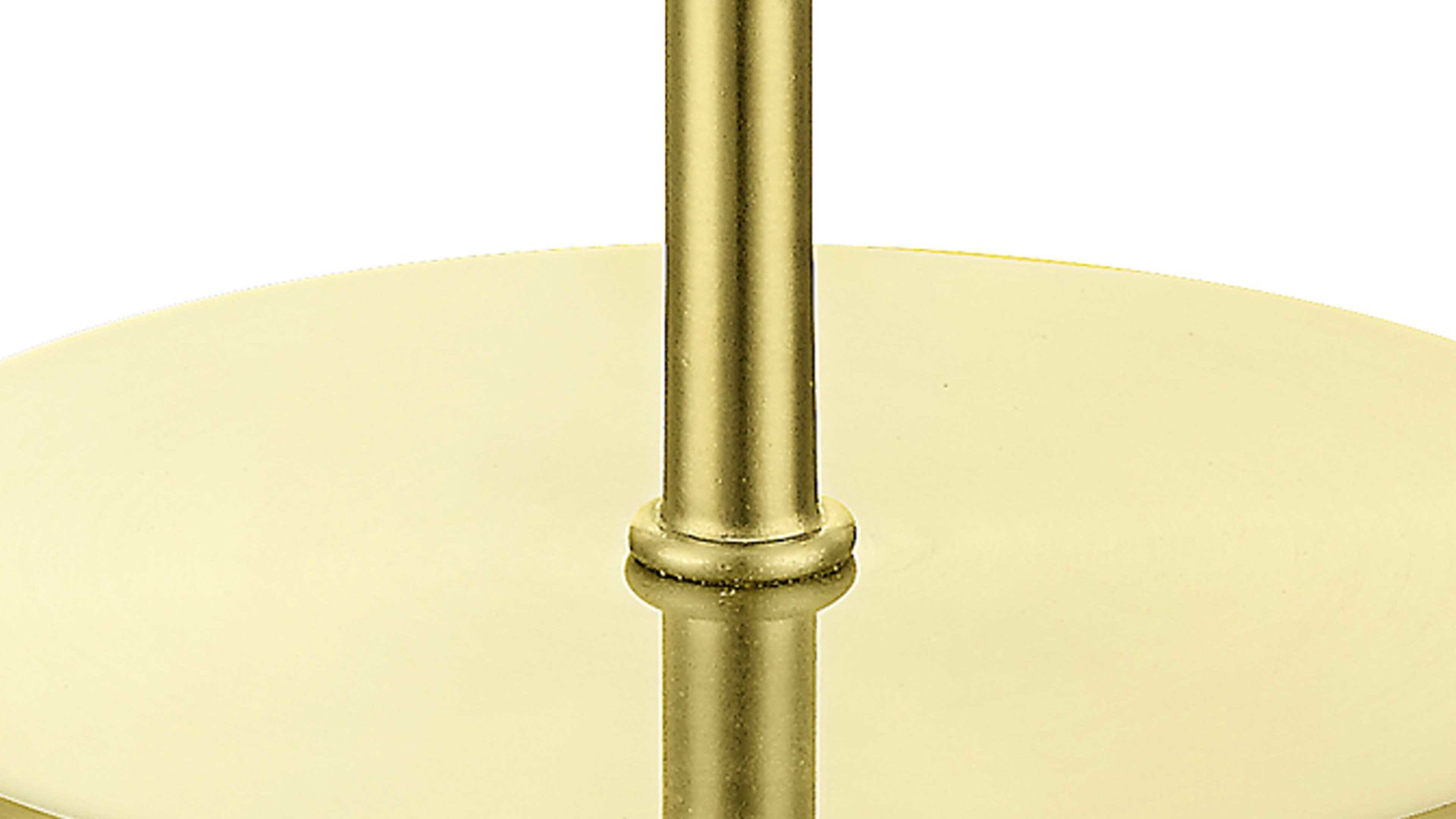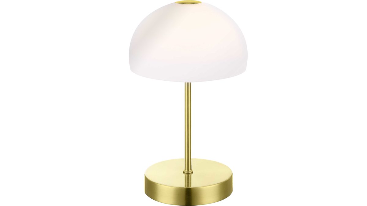 Und auch die Verarbeitung des Wohnaccessoires ist besonders hochwertig. So ist das Gestell matt messingfarben, während der charakteristische Schirm aus edlem Opalglas besteht. Diese stilvolle LED-Tischlampe ist ca. 27 cm hoch und hat einen Durchmesser von ca. 15 cm. Das integrierte 5 Watt LED-Leuchtmittel gehört der Energieeffizienzklasse F (Spektrum A bis G) an.