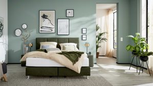• Die Abbildung zeigt ein Wohnbeispiel, welches auch Dekoration sowie separat erhältliches Zubehör enthält. Im Lieferumfang enthalten ist ein Boxspringbett.