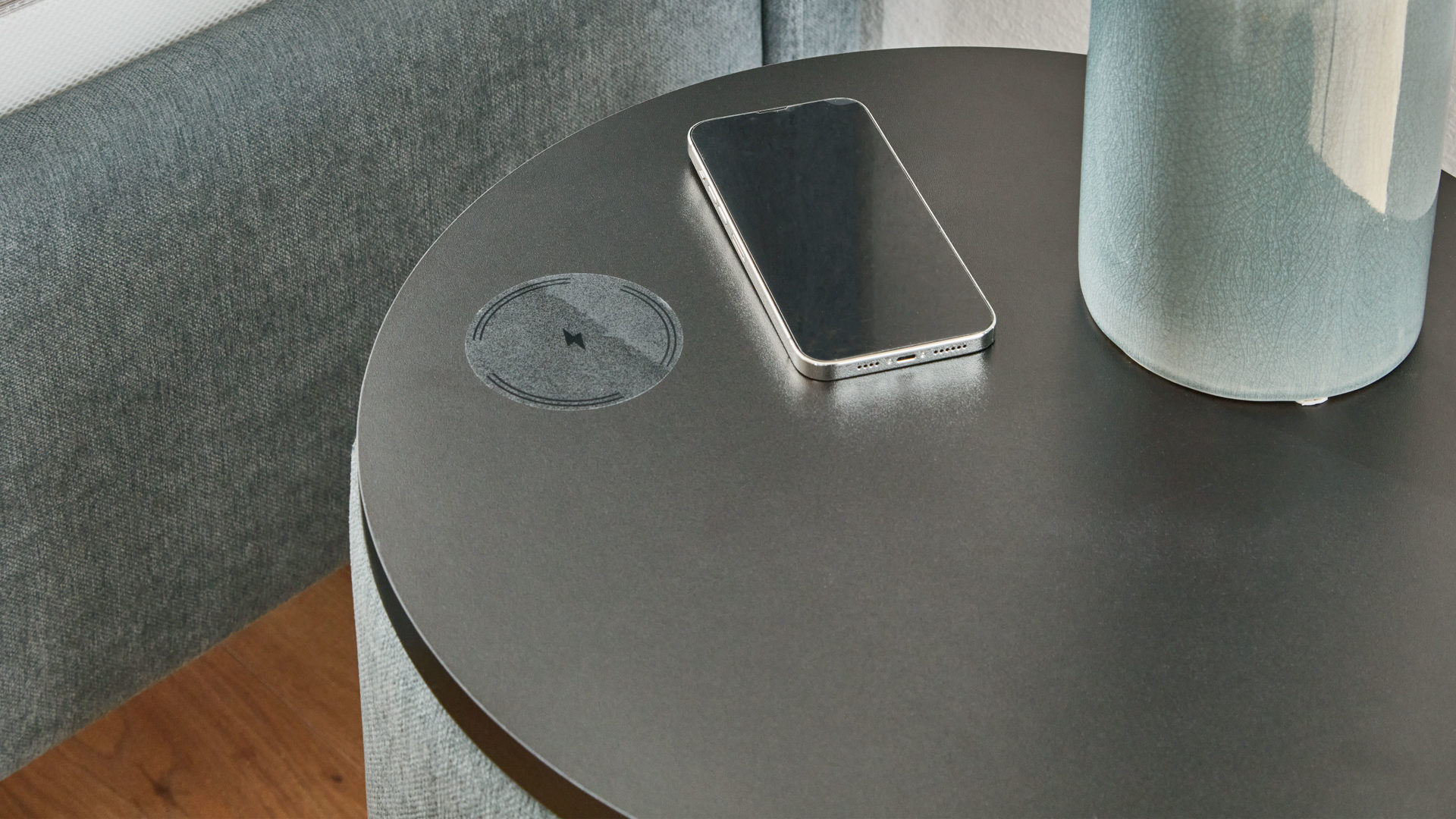 Sie besteht aus einem mit stahlfarbener Mikrofaser bezogenen Holzkorpus, schwarzen Kunststoffgleitern und einem akzentuierenden Oberboden mit schwarzer Oberfläche, auf dem Sie beispielsweise Platz für eine Nachttischlampe und Ihre aktuelle Abendlektüre haben. Sowohl der Durchmesser als auch die Höhe des Nachttisches belaufen sich auf ca. 48 cm. Der Clou ist die Induktionsfläche, auf der Sie ganz bequem Ihr Smartphone aufladen können.