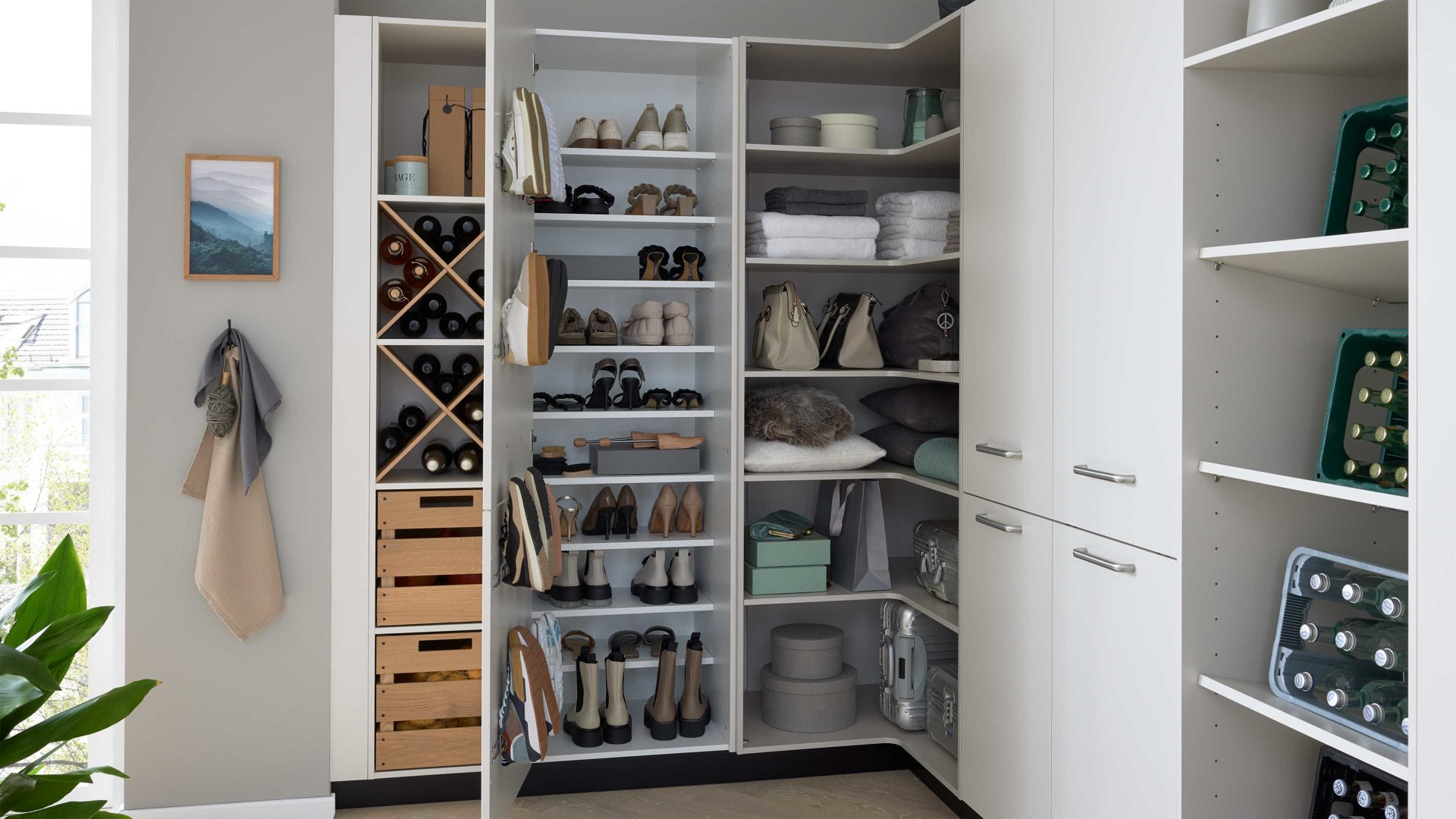 Verschiedene Schrankelemente, offene Bereiche und durchdachte Aufteilungen ermöglichen es Ihnen, Reinigungsutensilien, Vorräte, Wäsche und Alltagsgegenstände übersichtlich zu verstauen.