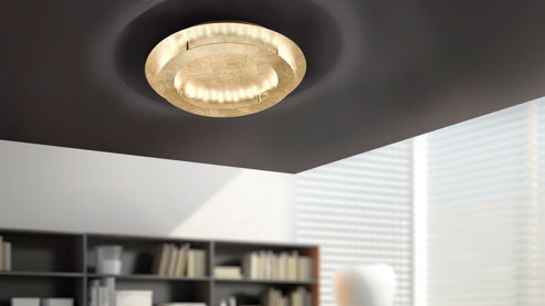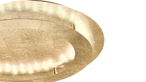 Mit der kreisrunden Paul Neuhaus Deckenlampe in der Farbe Gold ist eine einzigartige und zugleich stimmungsvolle indirekte Beleuchtung möglich. An der runden Deckenplatte ist ein Ring befestigt. Nicht nur mit der schönen Farbe begeistert die moderne Deckenleuchte Nevis, sondern auch mit einem außergewöhnlichen Design und Material. So fällt insbesondere die hochwertige Gestaltung der Lampe auf, denn die Hammerschlaglackierung verleiht dem goldfarbenen Metall eine strukturierte Oberfläche.