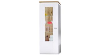 Die Vitrine 10 aus dem modernen Wohnprogramm Cali verbindet kratz- und stoßfeste, weiße Melaminoberflächen mit Wotan Eiche-Nachbildung - und dadurch puristische Eleganz mit natürlich anmutendem Charme. Ein robuster Metallgriff und Details aus Klarglas runden den stilvollen Vitrinenschrank mit Maßen von ca. 70 x 197 x 38 cm (BxHxT) stimmig ab.