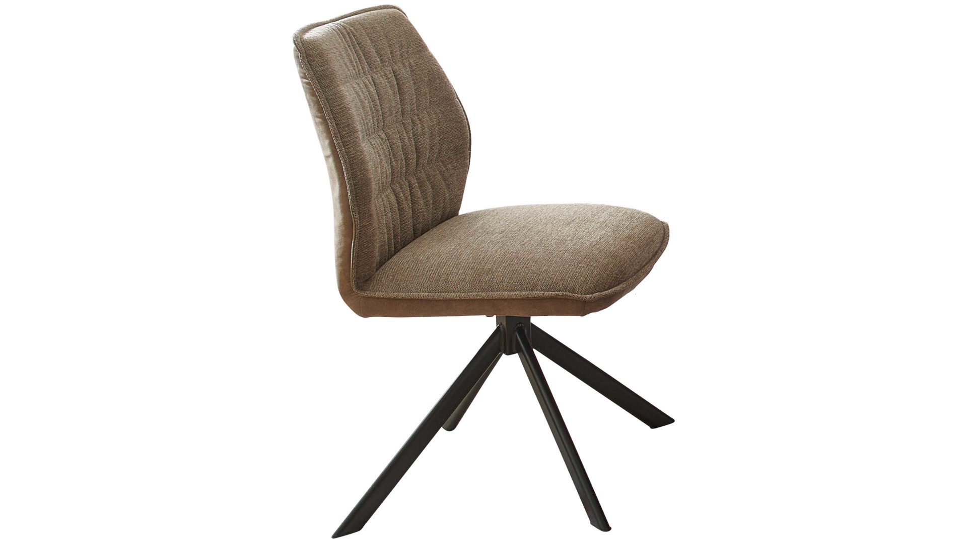 Er kombiniert ein mattschwarz lackiertes Stativgestell aus robustem Eisen mit einem taupefarbenen Mikrofaserbezug in Lederoptik und fügt sich in verschiedene Wohnstile harmonisch ein. Zu den optischen Highlights des Esszimmerstuhls gehört neben der Formensprache und den perfekt aufeinander abgestimmten Farben der markante Quereinzug im Rücken. Praktisch begeistern die Drehbarkeit um 180 Grad mit Rückholfunktion sowie die bodenschonenden Gleiter am Gestell.