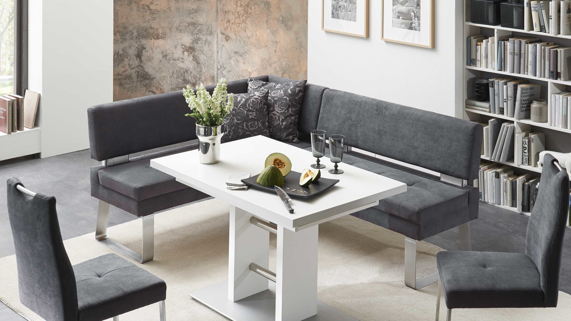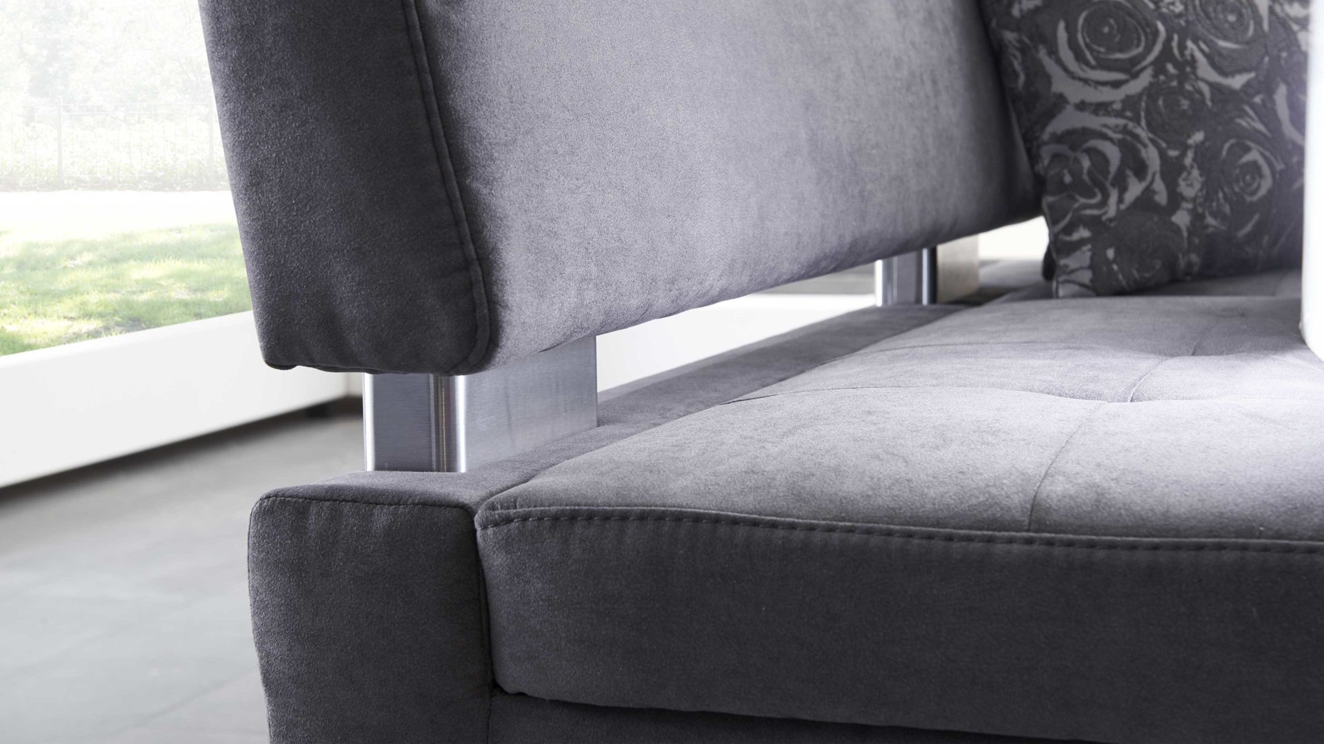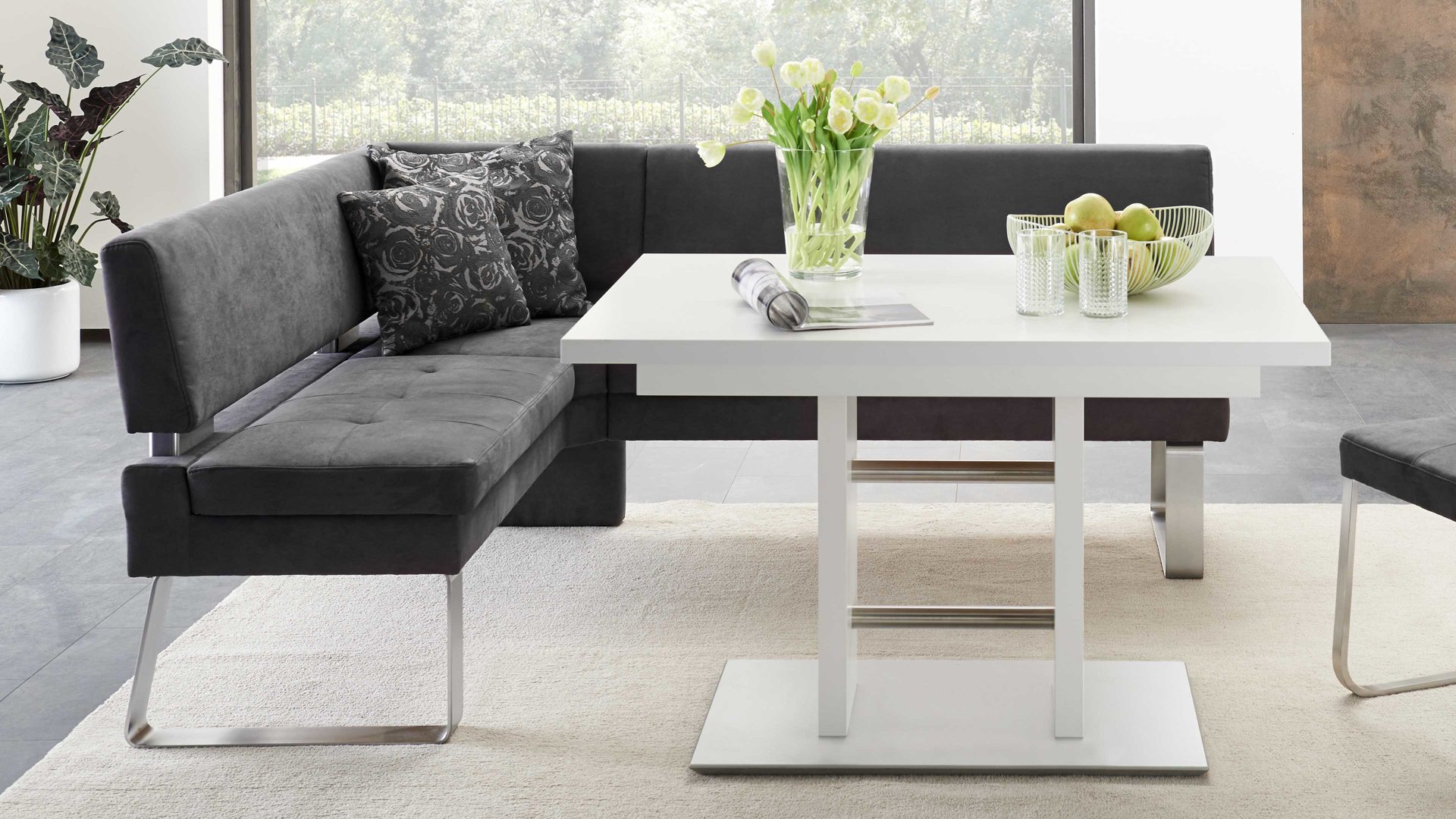 Auch optisch macht die Polster-Eckbank einiges her. Als stabilisierende Basis fungiert ein klassisch-edelstahlfarbenes Metallkufengestell. Es harmoniert vorzüglich mit dem soften Mikrofaserbezug im modernen Farbton Anthrazit. Perfekt abgerundet wird die Eckbank Genesis durch die Distanzhalter, die wiederum im Edelstahlton gehalten sind.
