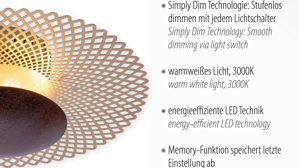 Über einen Wandschalter dimmen Sie die Deckenlampe zudem ganz nach Bedarf und Ihren individuellen Vorstellungen. Installieren Sie die formschöne Lampe, die einen Durchmesser von ca. 45 cm und eine Höhe von ca. 16 cm hat, in Ihrem Wohnbereich oder Schlafzimmer und kombinieren Sie sie mit weiteren Modellen dieser tollen Leuchtenserie, um einen einheitlichen Look zu erzeugen. Eine LED der Energieeffizienzklasse G (Spektrum A bis G) mit 18 Watt, 1400 Lumen und 3000 Kelvin ist bereits inbegriffen.