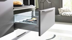 Ergänzt wird er durch den Auszugschrank (Typ 2325) mit schiefergrauem Abdeckboden (Typ 16849), der zusätzliche Ablagefläche schafft. Maße: ca. 60 x 29 x 46 cm (B/LxHxT). Die gezeigten Glas-Seitenwände der Schränke erhältst du gegen Mehrpreis.